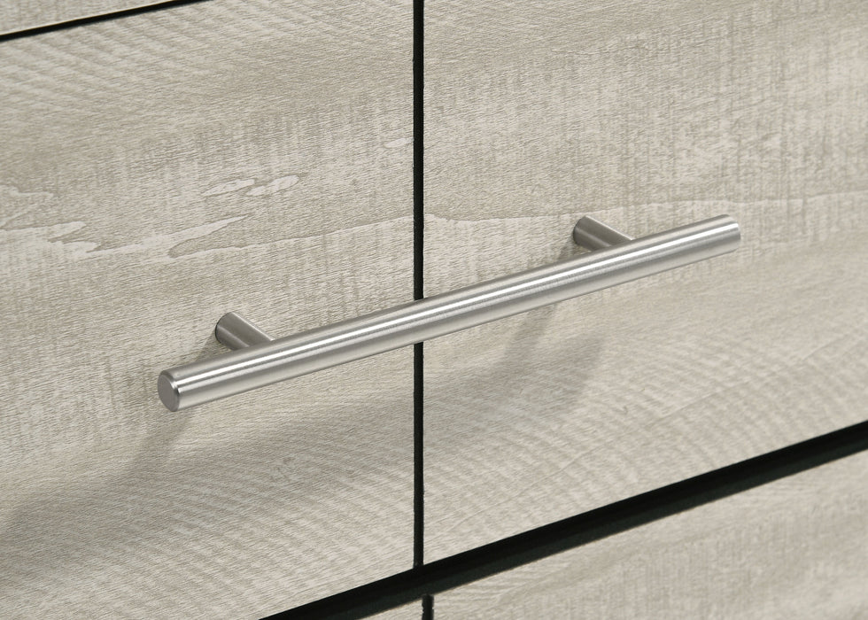 This contemporary bedroom set blends cool, modern style with rustic charm. Its Yin & Yang design pairs a rustic cream finish over engineered paper veneer with a sleek, floating bed. The headboard's padded, cream bouclé fabric adds softness, while polished nickel hardware brings shine. Crafted from asian hardwood and engineered wood, drawers feature English dovetail joinery and Center metal glide for durability. This set is chic, stylish, and full of unique details.