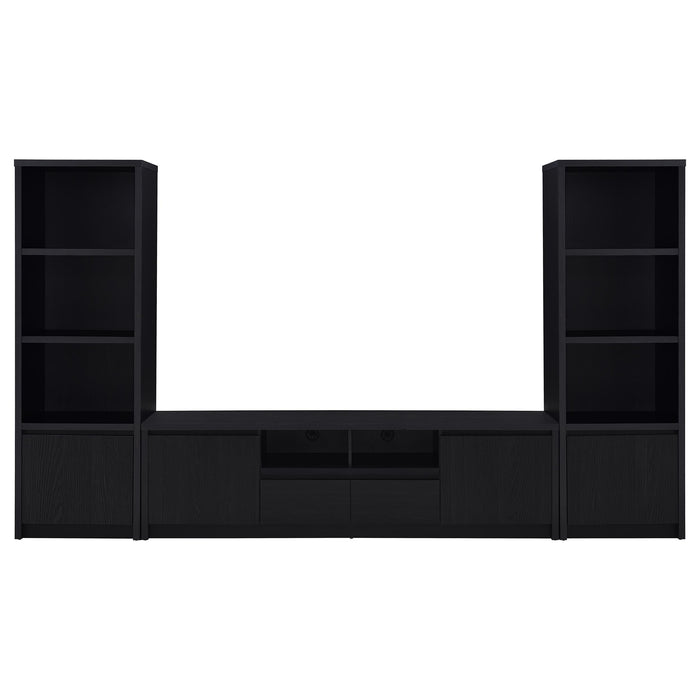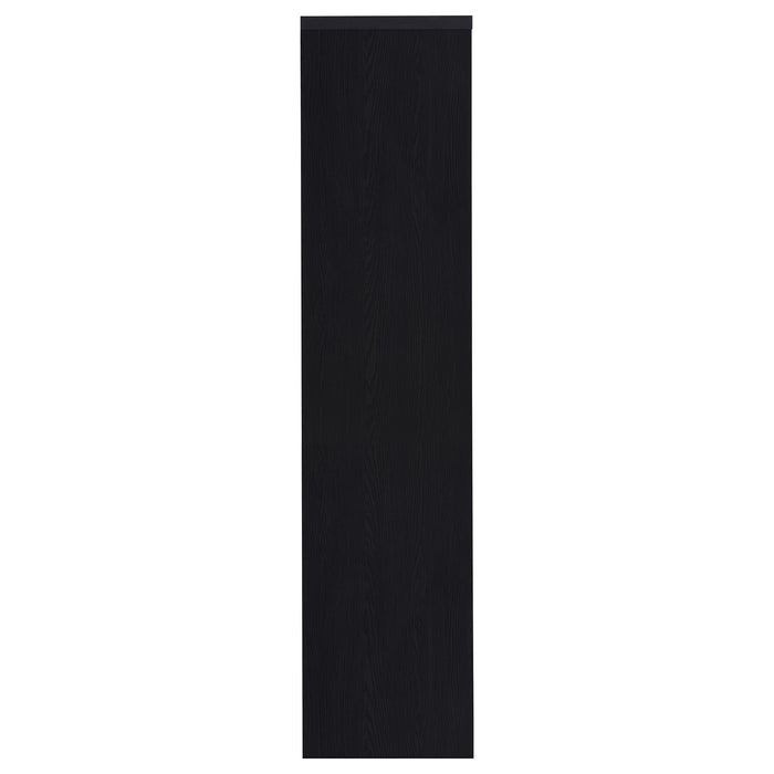This contemporary media tower combines functionality and modern design in a sleek black finish. Built from durable engineered wood with a scratch-resistant laminate veneer, it features three open shelves for organizing media devices, books, or decor. A bottom cabinet offers concealed storage to keep clutter at bay. Its tall, clean-lined silhouette provides vertical storage, perfect for maximizing space in living rooms, home offices, or entertainment areas.